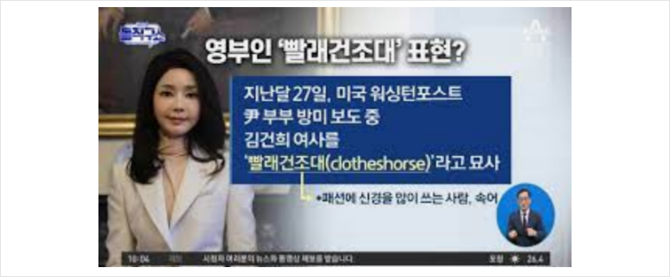 워싱턴포스트'가 대통령부인 김건희 여사를 '유명한 빨래건조대(clotheshorse, 패션에 관심 많은 사람을 칭하는 속어)'라고 표현해서 화제가 됨. 클로스홀스(빨래걸이)는 '옷 유행에 지나치게 관심이 많은 사람을 뜻하는 속어로 쓰인다고 한다.