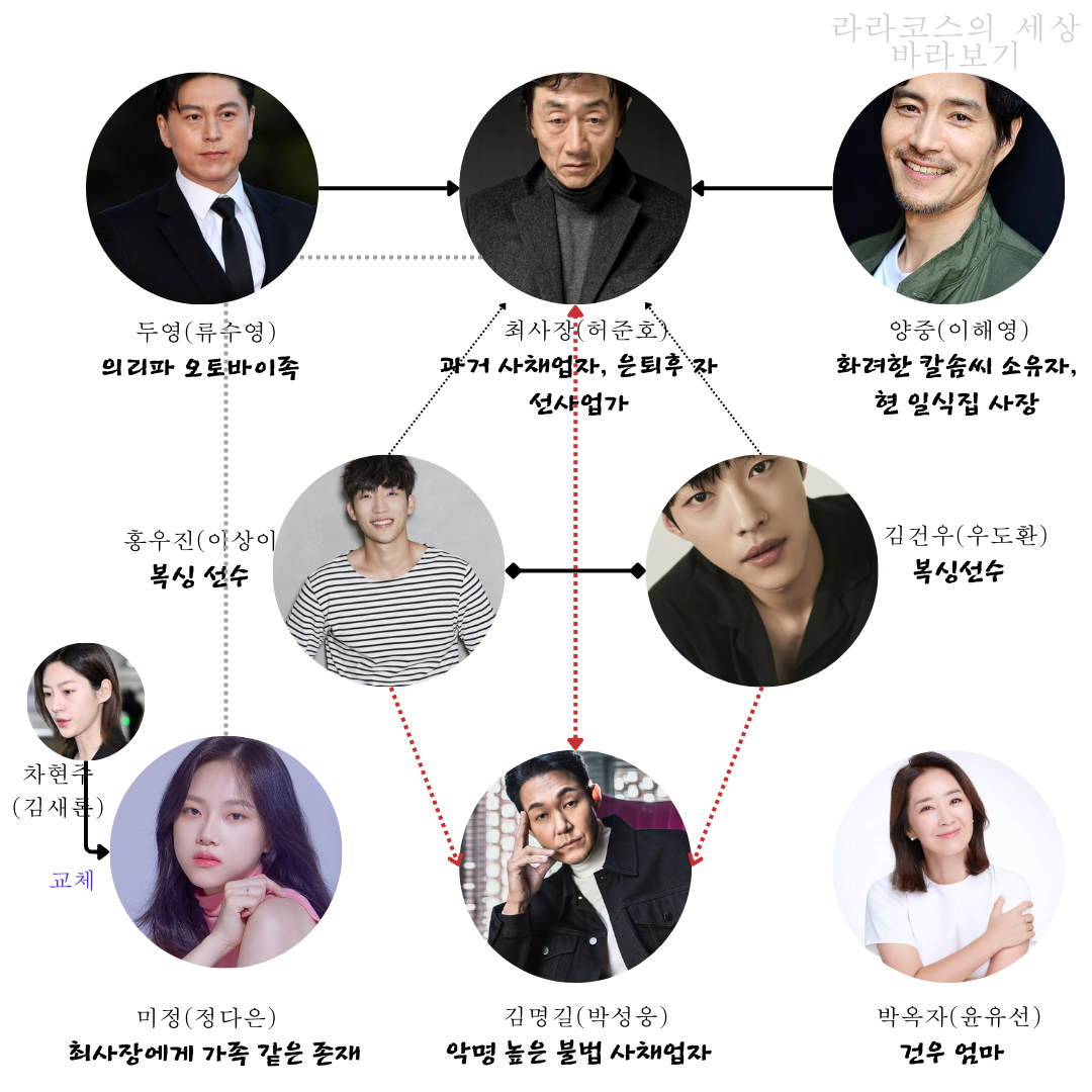 - 김건우(우도환) - 복서, 해병대 출신, 착한거랑 성실한게 가장 자신 있는 순수하고 우직한 청년. 엄마가 사채업자의 덫에 걸려 명길과 대적하게 된다.