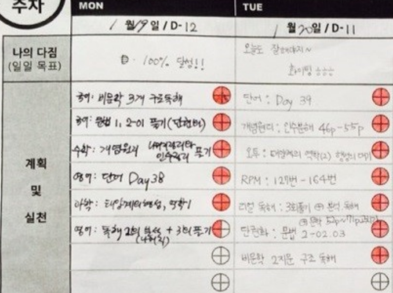 아예 실천하지 못한것은 X 표시, 완성못한 일은 다음날로 연기 되어 마음이 무겁습니다.