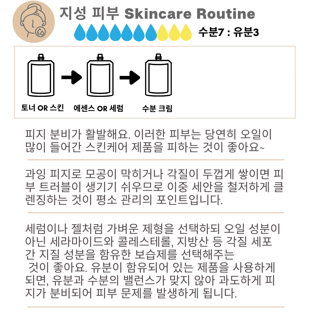 이번 포스팅은 크게 기름의 보유량에 따른 '지성', '건성' 피부로 나누어 정리하였습니다.