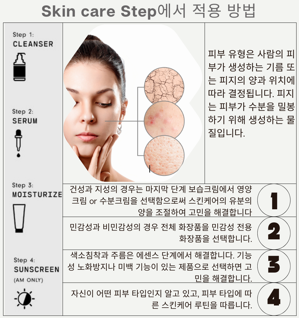 - 피부 타입별 화장품의 '제형', '바르는 순서'를 염두해 보세요.
