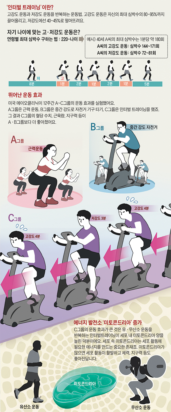 -고강도 인터벌 운동 추천. 심박동수를 올리는 훈련이 필요. 말하기 어려울정도로 격렬하게 운동하면 텔로미어라는 장수유전자가 활성화된다고 합니다. 텔로미어가 다 닳으면 세포분열이 멈추게 된다고 하네요.